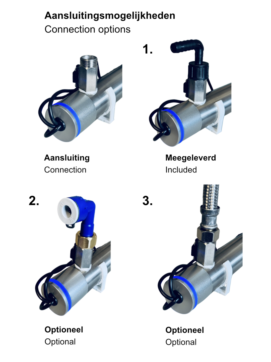 The UV-C Water Sterilizer comes standard with a 90° hose barb with 1/2” union nut.