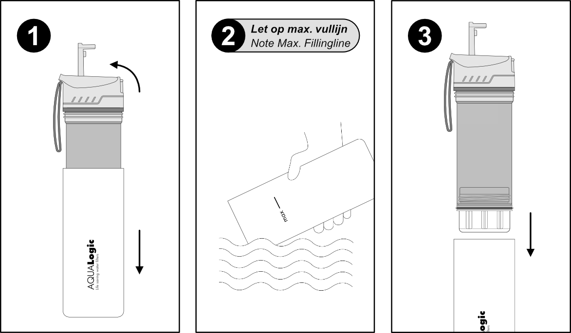 2. Fill the outer bottle with (as clear as possible) water; note the max. filling line