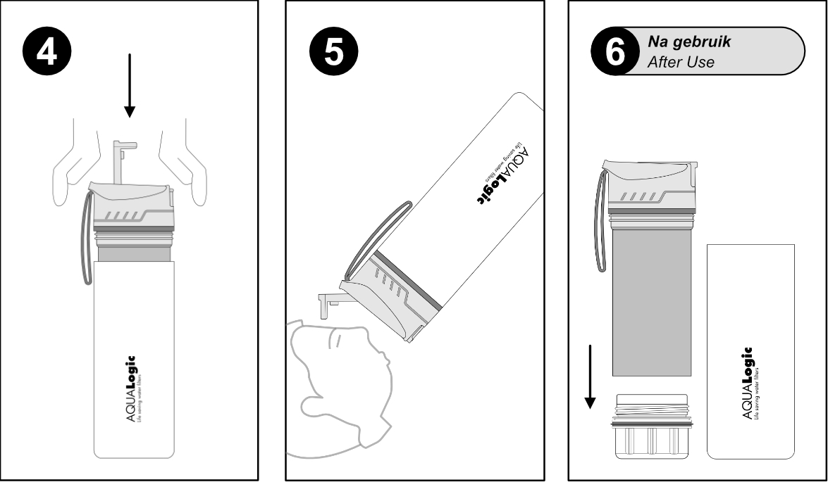• Avoid cross-contamination: Do not fill the inner bottle with contaminated water. Always handle the filter with clean hands and keep the mouthpiece clean.